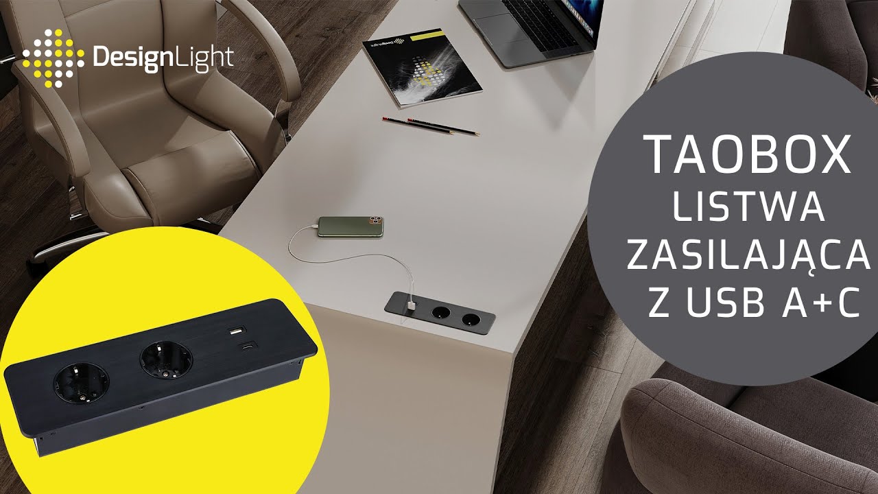 Model TAOBOX-CZ-2FR-UAC-01 od firmy DESIGN LIGHT to listwa zasilająca wyposażona w dwa gniazda sieciowe typu french oraz dwa porty USB (typu A+C). Nowoczesne, minimalistyczne wzornictwo i kompaktowa forma gniazda sprawdzą się w biurkach, szafkach RTV, w pobliżu blatów kuchennych lub w szafkach wiszących.